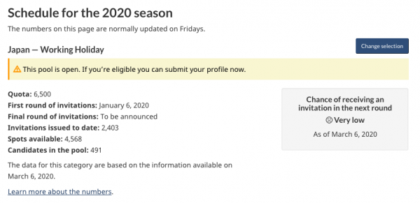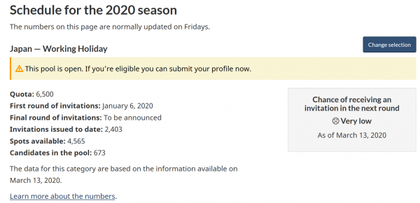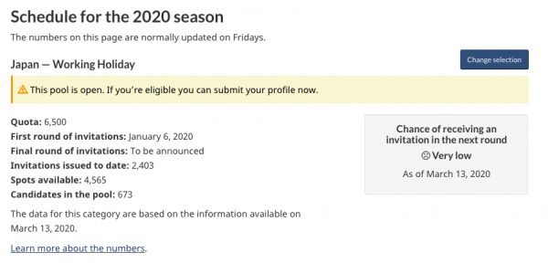 カナダ時間の毎週金曜日に発表されるカナダ ワーキングホリデービザ最新情報ですが、前回3月13日以降更新されておりません。コロナウイルスの影響によるものなのかなと思うのですが、定かではありません。