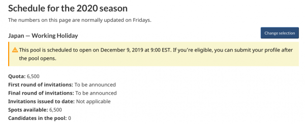 カナダ時間の12月9日(月)東部標準時間午前9時から2020年度の抽選エントリースタートとのことです。