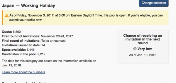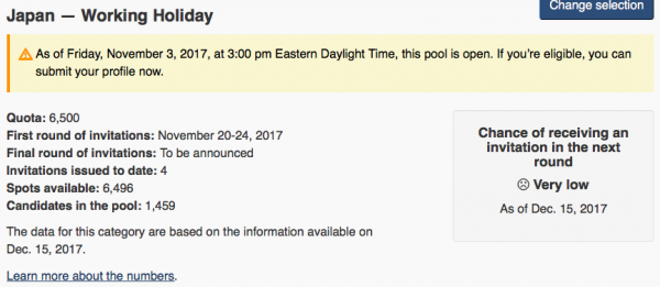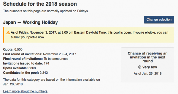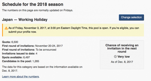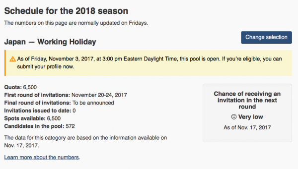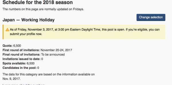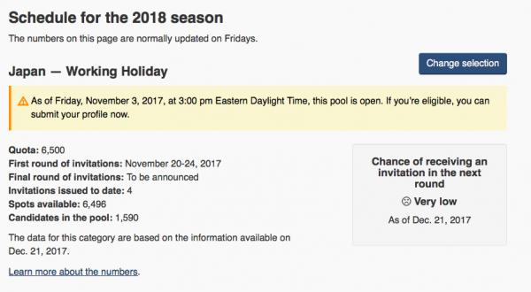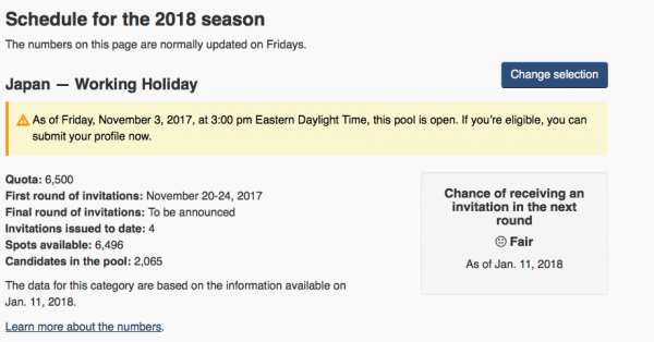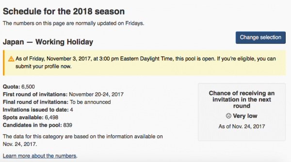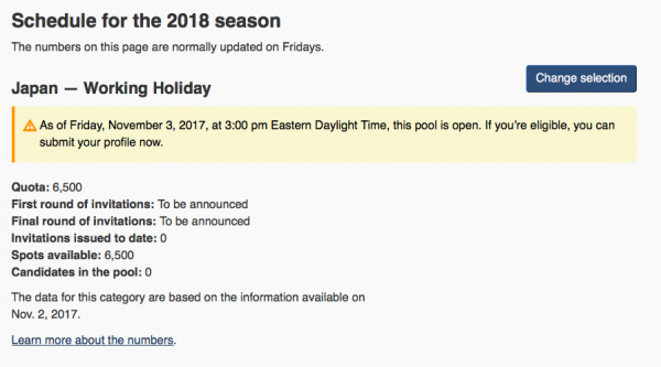 カナダ時間の毎週金曜日に発表されるカナダ ワーキングホリデービザ最新状況が更新されてますが