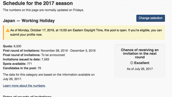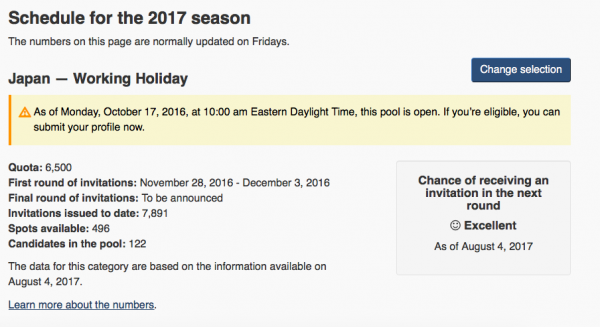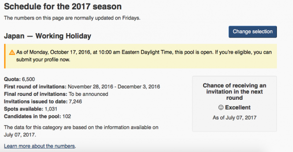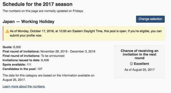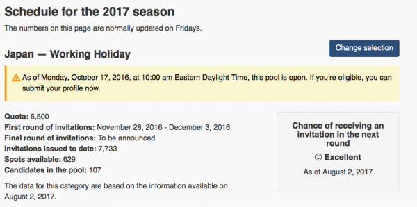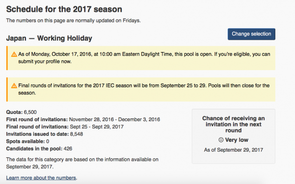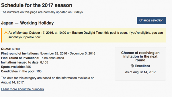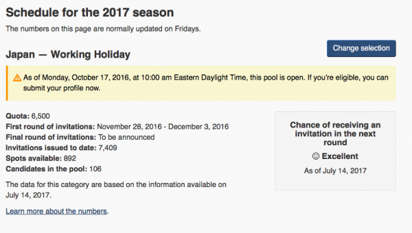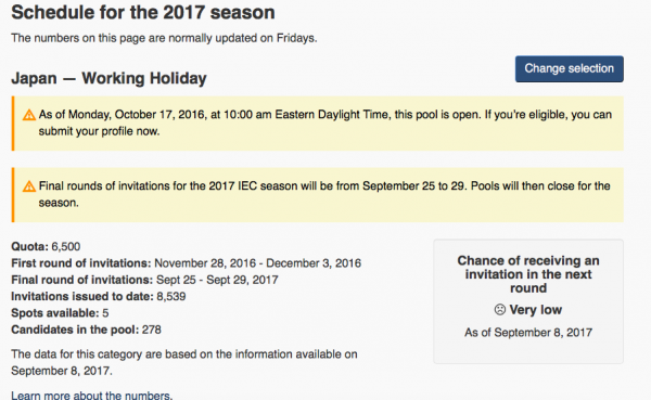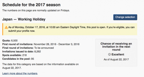 毎週更新される2017年カナダ ワーキングホリデービザ残数状況